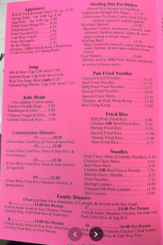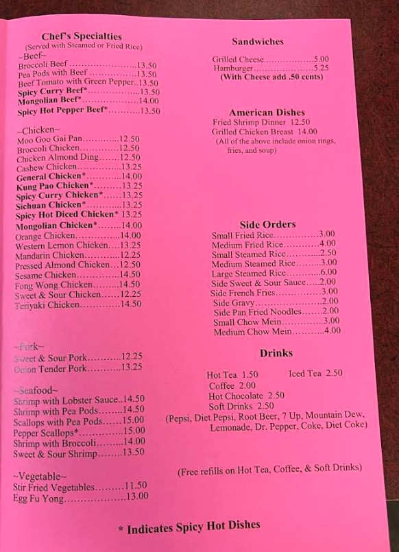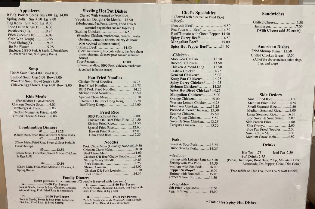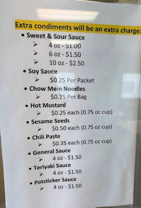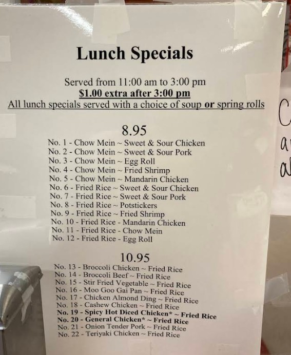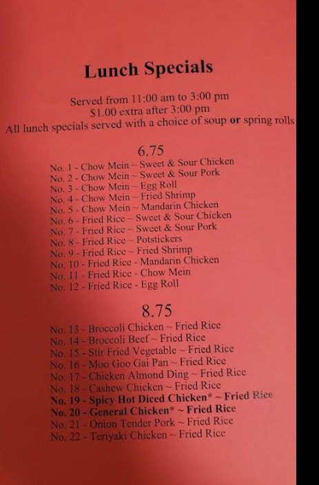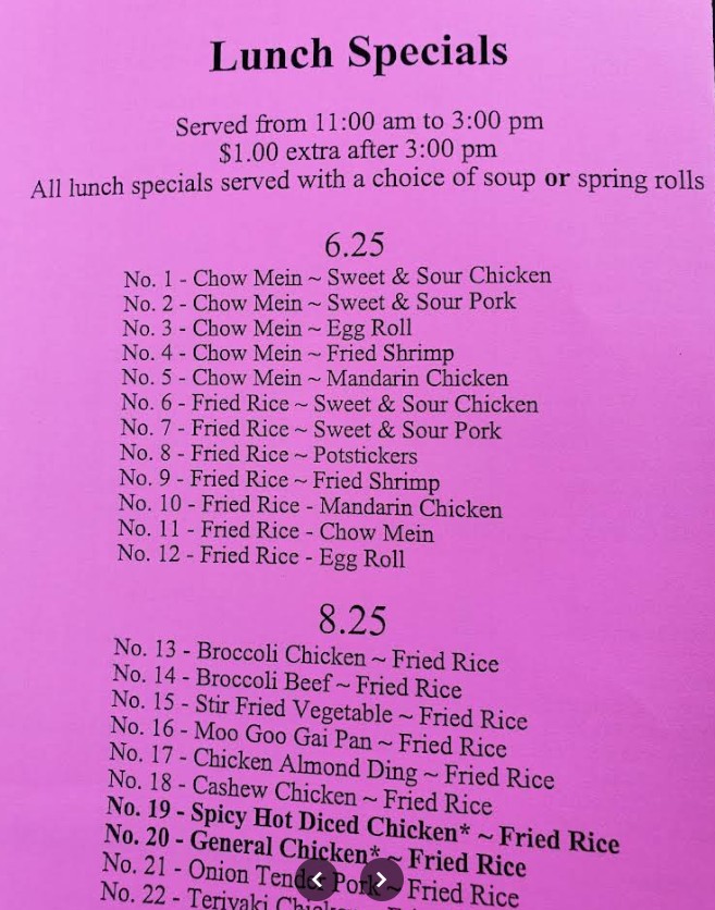 Good Chinese Food, they bring your food out pretty quick, sometimes they get a big rush & get behind on cleaning the tables, but they are good about getting them cleaned up well to get you seated. I recommend the #7 on the lunch menu sweet & sour pork with fried rice. The #6 Sweet & sour Chicken with fried rice is also good. They offer a spring roll or soup, the soup is good as well. They sell Pepsi Products. They accept, cash, card, or even Apple Pay. There is an area set up where big groups could be sat.